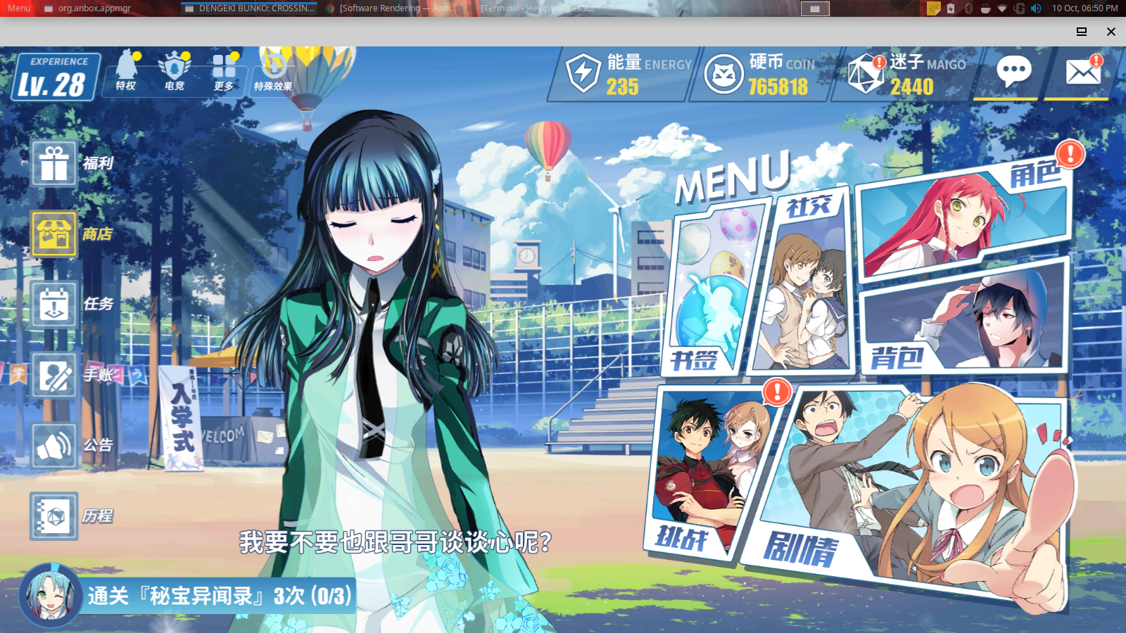 等等,还没说完哈哈,如果点击授权后djwk自动关闭或者卡着,就得开启anbox的software acceleration来启动anbox再登录了(详情参见 adb logcat ) 登录成功后关闭anbox再关闭software acceleration才进去玩 就可以啦(^__^) 嘻嘻……